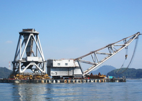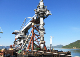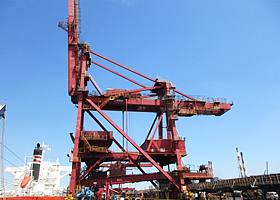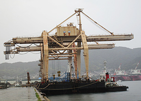 本船やしけから、各種チップ、穀物、砂、砂利、石炭、鉱石等のばら物もしくは粉末状の積荷を専門に陸揚げするクレーンです。